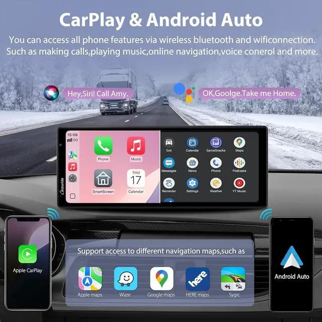 Seamless Integration with Smartphone(IOS/Android) CARPURIDE 10.26" portable car stereo compatible with Carplay & Android Auto. After link wirelessly, puting all your phones best features in a clean, safe, and easy-to-use hd touchscreen, wirelessly handle gps navigation, messaging, phone calls, bluetooth music, Siri. Compatible with IOS 6 and above, Android 11 and above.