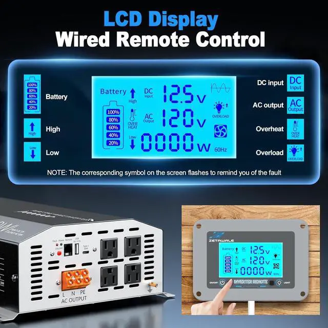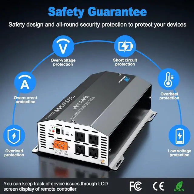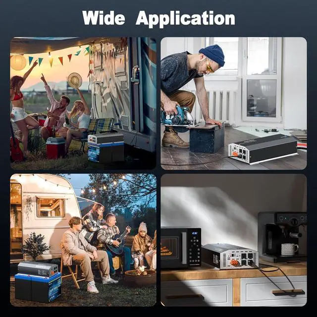 All-round Advance Protections: This 12V 3000W power inverter includes overload, over-voltage, under-voltage, over-temperature, and short-circuit protection. The built-in advanced dual ligent cooling fans greatly reduce the machine's temperature, preventing overheating, minimizing noise, reducing battery consumption, and extending battery life.