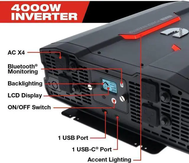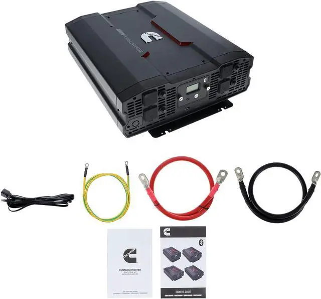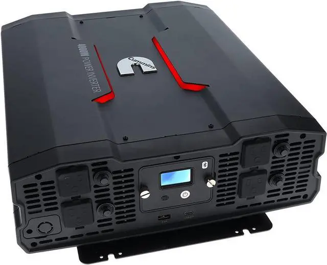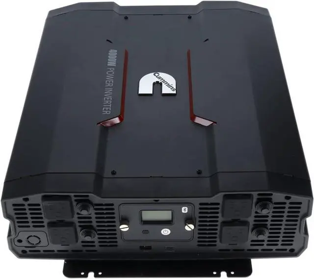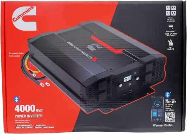 This powerful DC to AC 4000 watt power inverter is easy to use and offers reliable power in off-grid situations and multi-purpose charging. It is a 12v to 110v power inverter perfectly suited for your on-the-go lifestyle and designed for Cummins fans. Enjoy the conveniences of home while on the road with this wireless power inverter that supports AC devices rated up to 4000 watts delivering continuous power with a high surge capacity for devices that require up to 8000 watts to start. This Bluetooth (R) enabled inverter offers advanced wireless control compatible with all Android (R) and iOS smartphones.