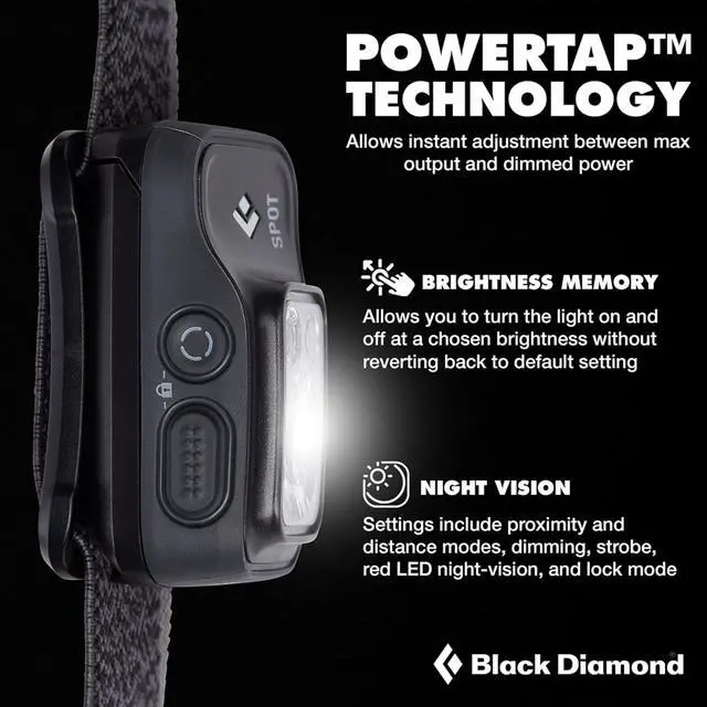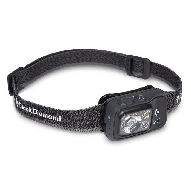 The Black Diamond Spot 400 LED headlamp has 400 lumens of power, now housed in a smaller, more efficient design. With a compact body, the Spot 400 features a low profile for better balance and is more ergonomic for added comfort. The user interface also has a second switch for easy lens mode selection. The Spot 400 is also Dual-Fuel compatible, allowing you to power the light with either a rechargeable BD 1500 Li-ion battery (sold separately) or three standard AAA batteries (included). The lights updated optical efficiency not only provides brighter light with more peak intensity, but also saves battery life thats easily trackable with a six-setting, three-LED battery meter on the side.