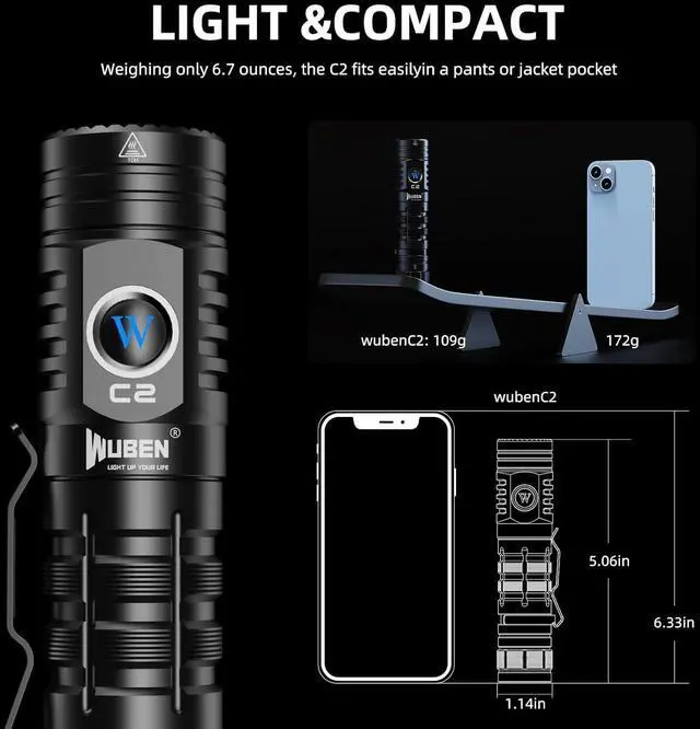 7 MODES & MEMORY FUNCTION & BREATHING LIGHT: WUBEN C2 has 4 basic modes: High-Med-Low-ECO(long press on the switch to cycle throw, with memory function), 1