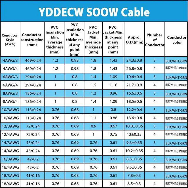 SOOW Electrical Wire Applications: This type of wire finds frequent use in industrial settings, as well as outdoor and marine environments. Each wire is made of 3 conductors, each conductor has an average thickness of 1 mm PVC insulation, the PVC jacket thickness is 1.4 mm enables its deployment in areas where harsh environment is prevalent. SOOW electrical wire is employed across various sectors including power generation, mining, oil and gas exploration, and marine operations. Its versatility extends to power and control circuits, portable tools and equipment, lighting fixtures, and portable appliances.