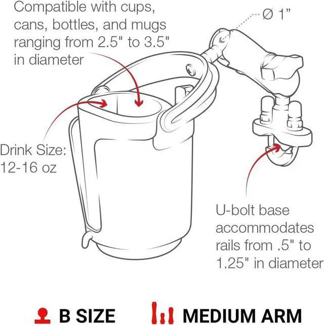 Compatible with cups, cans, bottles, and mugs ranging from 2.5" to 3.5" in diameter; zinc-coated U-bolt base accommodates rails from .5" to 1.25" in diameter