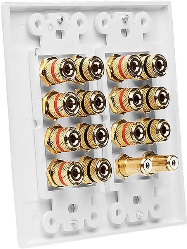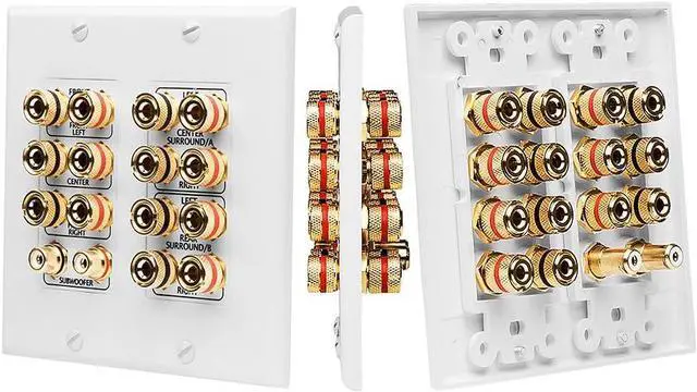 Connect your 7 1 home theatre system with one plate Please click the picture to see details of the terminal Decora wall plates offer a variety of hook-ups - connectors banana jacks and binding posts that can accommodate a single speaker pair dual speaker pair or a complete home theater system