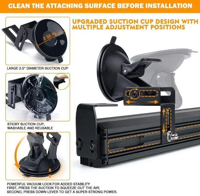 FLEXIBLE INSTALLATION: Includes 3 strong and stability suction cups bracket, firmly mounts on a smooth windshield or back window surface. Or mount with the included nuts and bolts for end 'L' brackets.