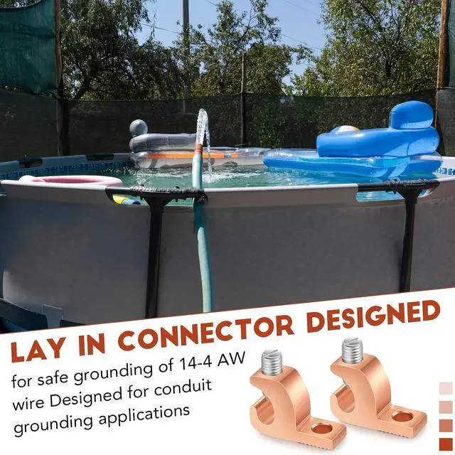 Applications: lay in connector designed for safe grounding of 14-4 AW wire Designed for conduit grounding applications, they can be applied for both grounding and bonding applications; They are suitable for grounding swimming pools, copper tubing, spa equipment, conduit sleeves, etc.; Stainless steel screws are included with the grounding connector to hold conduit securely in place for long periods of time