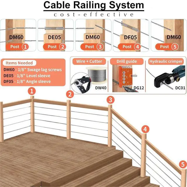 We have a cost-effective cable railing system: 1/8" lag screw DM60, 1/8" steel cable and cutter DW40, hydraulic Crimper DC01. Drill guide DG12 can help you with drilling.
