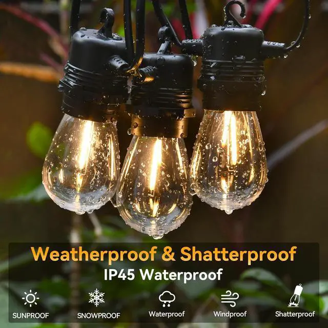 • Shatterproof and WeatherproofDon't let weather or accidents dim your outdoor lighting.These colorful string lights for outside use high light transmittance plastic bulbs that are shatter-resistant and weather-resistant,making them last longer than other fragile glass bulbs and perfect for outdoor use.With an IP44 waterproof rating,these outside lights are designed to withstand sunlight,rain, snow and wind,you can rest assured that these lights will continue to shine brightly.