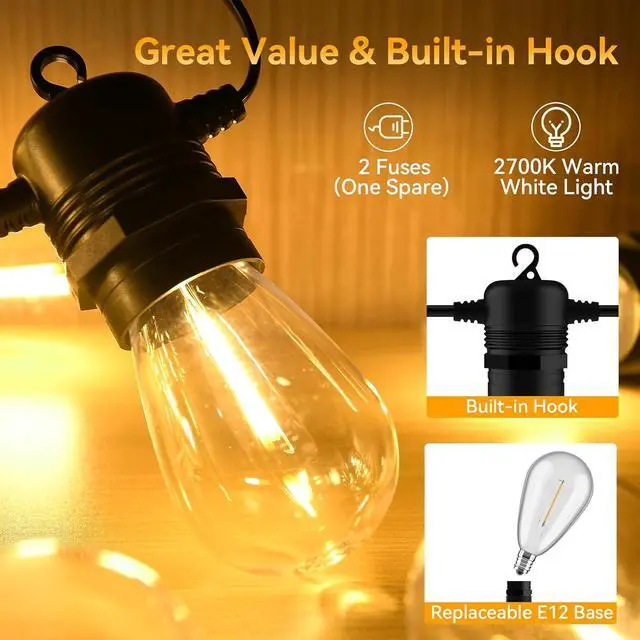 • Energy-Saving & Dimmer CompatibleWith dimmable capability (Dimmer NOT Included) and spare bulbs for replacements, our outdoor lights will continue to brighten up your life even if some bulbs break or are removed. You can easily adjust the ambiance to suit any occasion. Elevate your outdoor space with our UL-listed led string lights that brighten up your patio, garden, backyard, rooftop, balcony, deck, porch, and more!