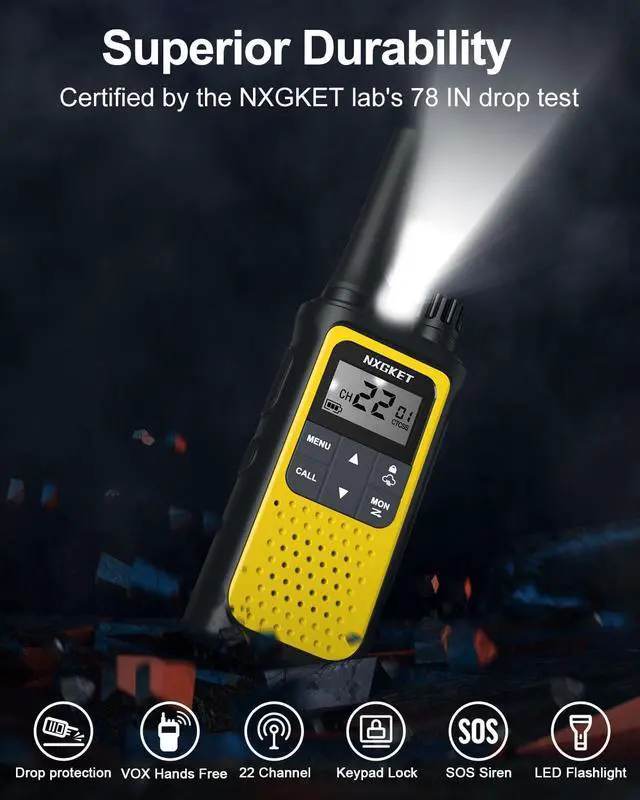 Easy to use with Multi-features: Bright color finish helps with visibility, NXGKET walkie talkies has large LCD screen, support many advanced features, as volume adjustment, Voice-activated (iVOX), Auto squelch, Auto memory, Auto scan, Low battery alert, Keypad lock(Channel-lock), Adjustable power, Drop-protection, Built in flashlight etc.