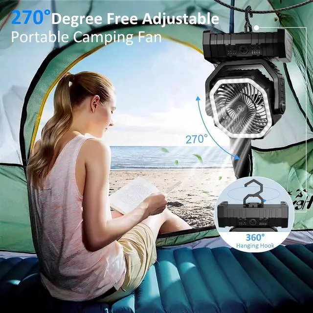 3-Level Brightness LED Camping Lantern: This portable tent fan boasts three adjustable brightness settings, allowing you to tailor the lighting to your preference. The lowest level provides a gentle and non-glaring light, perfect for creating a cozy ambiance. Additsional, the maximum brightness setting floods the entire tent with brilliant illumination. Designed with camping, hiking, fishing, and various nighttime outdoor activities in mind, it constitutes an essential piece of camping gear.