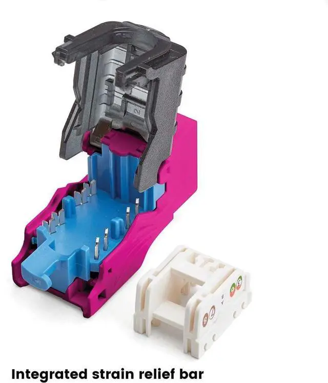 Self-terminating means no more punch down tools required. Our 90-degree tool-less design provides maximum snap-shut confidence. The dual-level termination cap is marked with highly visible colors for easy T568A or T568B wiring and helps keep conductor pairs separate.