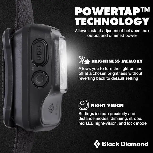 In addition, the updated optical efficiency not only provides brighter light with more peak intensity, but also saves battery life that you can now easily track with a six-setting, three-LED battery meter. The Spot 400-R head lamp offers peripheral lighting for close-range activities like sorting gear, cooking, or reading in camp and it sports an IPX8 waterproof housing. The Brightness Memory feature allows you to turn the light on and off at a chosen brightness without reverting back to a default setting. Plus, the Spot 400-R's PowerTap Technology makes for instant brightness adjustment settings.