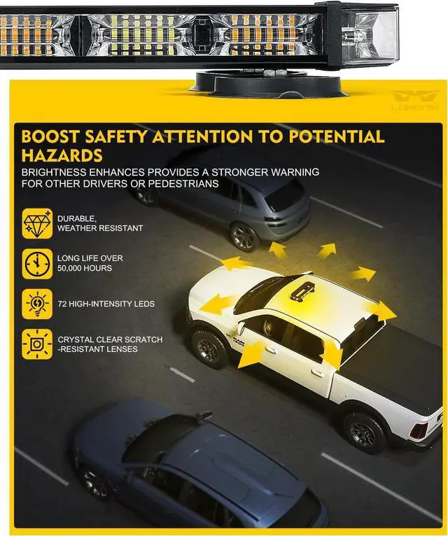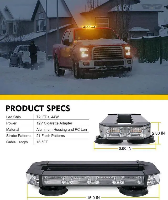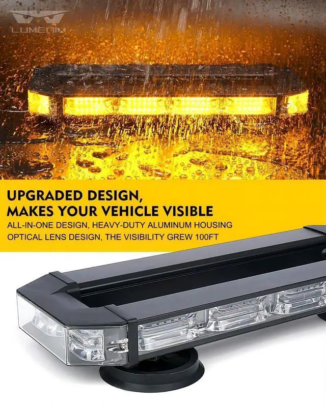 EASY INSTALLATION AND DURABILITY - Installing our emergency strobe lightbar on your truck is a breeze. The heavy-duty aluminum magnetic mount bracket, equipped with suction cup padding, provides a strong and stable attachment to your vehicle's rooftop. Our warning safety lights is built to last, featuring a rugged and weather-resistant design. It can withstand harsh outdoor conditions, ensuring long-lasting performance even in extreme weather.