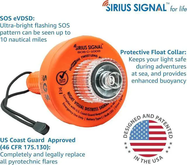 Flashes US Coast Guard spec SOS signal for up to 60 hours, many times longer than USCG requirements; batteries included
