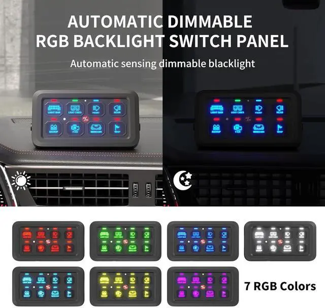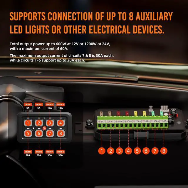 Wide Application - The whole waterproof marine switch panel supports a maximum current rating of 60A at the same time, and operates within a temperature range of -40 to 221 (-40°C to 105°C). Suitable for 12V/24V automotives light controlling, such as UTVs, ATVs, cars, SUVs, jeeps, boats, marine, etc.