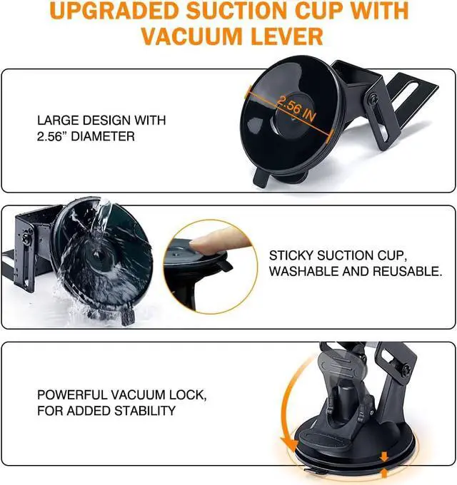 Upgraded suction cup with vacuumleverhas sticky surface that is washable and reuseable.