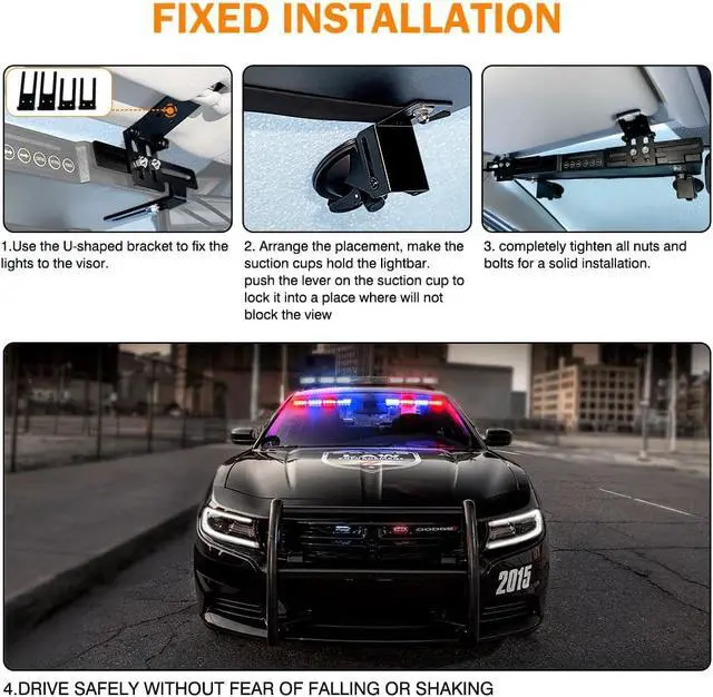 INSTALLATION - This strobe visor light bar includes 4 reinforced mounting brackets. The large vacuum lock suction cup can be reused and cleaned to ensure firm adsorption on the glass contact surface. With the sun visor adjustable bracket, it will run stably even on rough roads. (NOTE: Will not fit Ford F-150, F-250, Econoline, Focus, Duramax, Equinox, Ram 3500, GMC Sierra 1500, Sentra, Altima, 4Runner, Mazda 3, Silverado)
