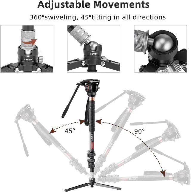 Mini Tripod Option: Locked down into 2 positions, the monopod feet enable 360° swiveling, 45° tilting in all directions and 90° drop-notch allows easily switch from landscape to portrait modes; the removable base can be used as a small table-top tripod