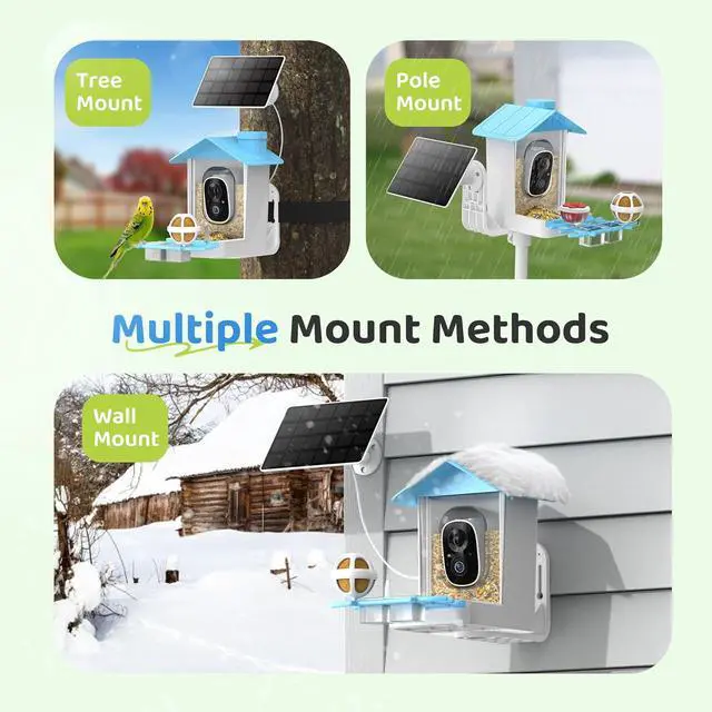 - DIY Different Add-ones Perch: The bird house with camera include perch, water feeder and fruit holders transform it into a versatile feeder suitable for various bird species. Multiple mounting methods to mount to a tree, pole, wall, or fence. You can enjoy a variety of birds in your garden