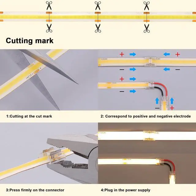 - Flexible Adhesive and CuttableCOB LED Tape Light has a strong adhesive on the back. Just clean the area to be mounted and stick the COB LED strip. Flexible strip can be used on certain curved and irregular surfaces. It is not limited to use on vertical walls.