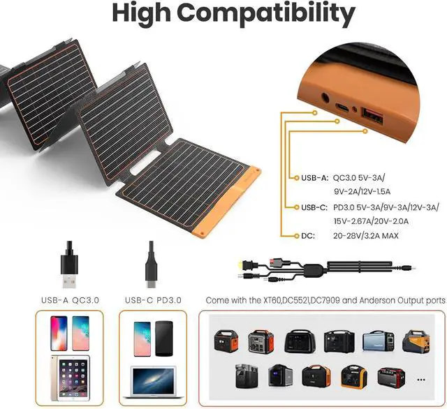 - Featuring versatile high-speed charging portsQC 3.0 (18W max) USB-A, PD 3.0 (40W max) USB-C, and DC (60W max at 20V-28V)this unit directly powers small-to-medium solar generators ( <300Wh), battery packs, iPads, smartphones (Android/iOS), and daily electronics. Note: Maximum voltage/current limits apply per port.