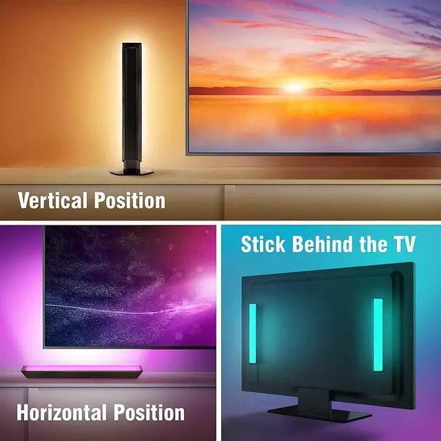- Versatile Placement: Included tabletop stands can be installed to place the lights next to or behind your TV/PC, or attach the bars to the rear of you TV usng the included adhesive. Whatever your desired effect, you can angle the light bars in any direction with the different mounting options.