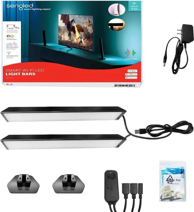 Enhance TV/Movie/Sports/Gaming experiences with the Sengled Smart Wi-Fi LED Multicolor Light Bars. Sleek and stylish light bars can be mounted to flat surfaces or stand in various directions. Control your lights in multiple ways On/Off, dimming, color change, color temperature change, schedule, scene setting. Dynamic audio-sync with built-in microphone for movie mode, game mode, music mode and more. Voice control using Alexa or Google Assistant.