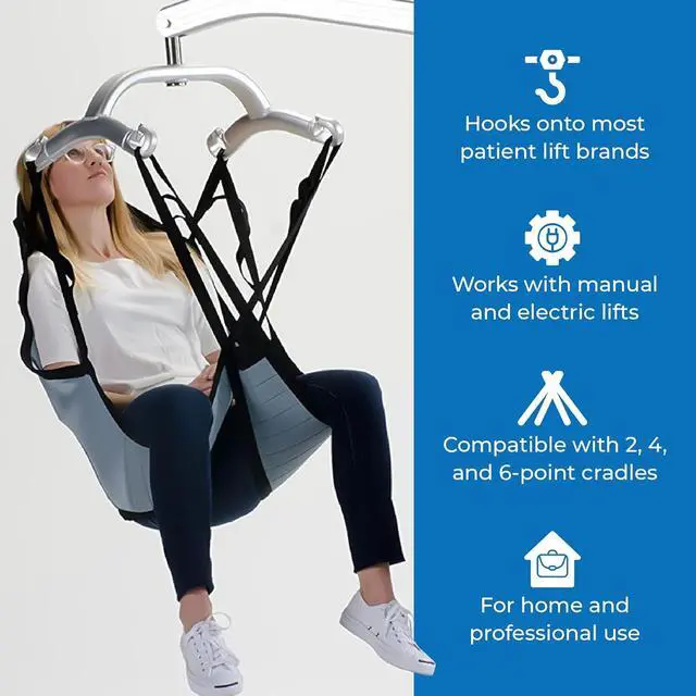 Transfer Freely. Use a manual or electric lift to transfer patients to and from beds, chairs, floors, toilets, baths, wheelchairs, and other surfaces. Safe for both the elderly and the handicapped. falseUse Safely. Our hoist for elderly is designed for patients of specific weights and heights. It works for individuals who are bariatric, bedridden, non-weight bearing, and have limited head control. falseBrand Compatibility. Our patient lift aid has 4 hook points that attach to the 2-, 4-, and 6-point spreader bars of medical lifts by Drive (R), Invacare (R), Lumex (R), and Medline (R).