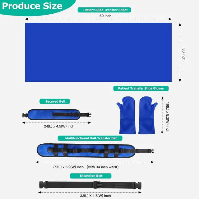 Patient Transfer Solution: This comprehensive home care nursing kit includes five essential mobility aidsa transfer belt, slide sheet, slide gloves, secure transfer belt, and extension beltproviding caregivers with versatile solutions for safe and effortless patient movement.