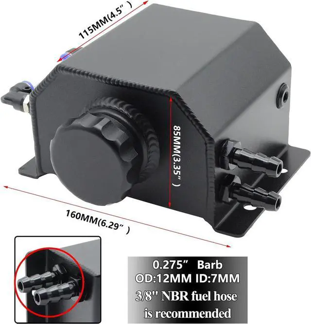 false- [Size] Male barb fitting thread size M14* 1.5. Work with 3/8"" ID fuel hose. Overflow tank storage volume 2Liter, about 4.2 pint. The Bottom port is radiator overflow, and Top port is tank overflow.