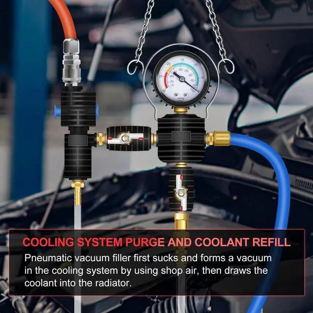 -Vacuum Type Coolant Filling Function: Pneumatic vacuum coolant filler first sucks and forms a vacuum on the cooling system by using shop air, then draws coolant into the cooling system. (Need a vacuuming tool and not included in the kit) Add coolant in vacuum, there is no large air pocket and avoid warping or other damage in engine. Normally, it takes 5-10mins to refill the coolant, the exact time depends on the size of the tank. Easy to operate and save time