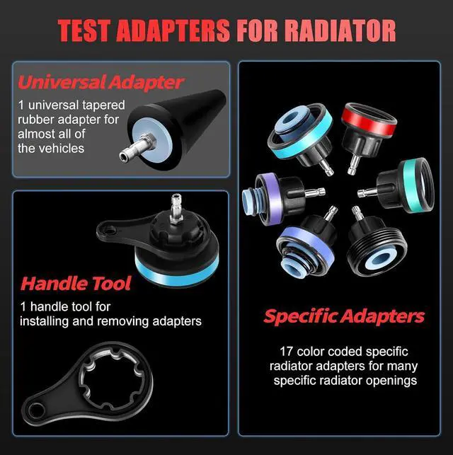 -Adapters: The cooling system vacuum leak tester and coolant refill kit is equipped with 17 special adapters and 1 universal cone rubber adapter, suitable for radiator openings on almost all types of classic and modern vehicles. Includes 3 radiator cap test adapters and 2 connectors to help diagnose most car radiator cap leaks. All adapters are color-coded and placed separately, can be easily selected according to the pictures indicated in the manual, which is convenient and not confused