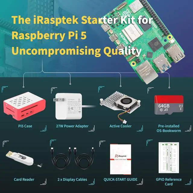 - Package Include1x Pi 5 8GB, 1x 64GB TF CardBookworm Pre-Installed, 1x 27W USB-C PD Power Adapter1x Pi 5 Case1x Card Reader, 1x Active Cooler2x 4K HDMI Cable, 1x Instruction Manual, 1x GPIO Reference Car