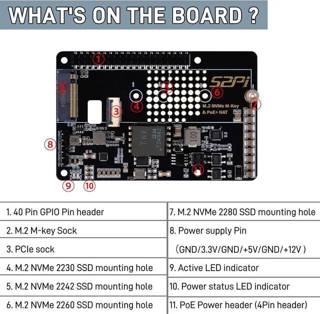 - High-Speed NVMe SSD Support --- The HAT board supports M. 2 NVMe SSDs for fast data access and storage.