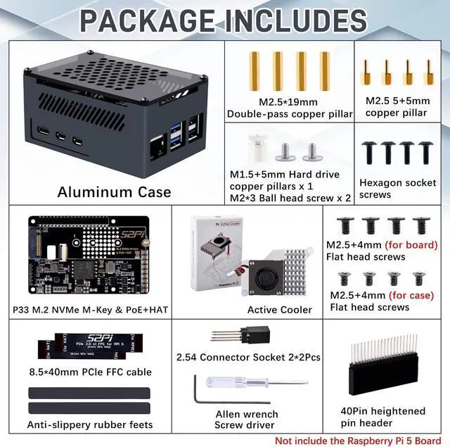 M. 2 Interface --- Utilizes the PCIe interface for high-performance communication between the SSD and Raspberry Pi. falsePower over Ethernet (PoE+) Capability --- Streamlines the power supply setup by allowing the Raspberry Pi 5 to be powered through the Ethernet port. false 5.1V / 4.5A Output --- Ensures that the Raspberry Pi 5 and any connected peripherals receive adequate power for optimal performance. false- Aluminum case is designed for P33 M. 2 NVME M-Key PoE+ Hat. It can access to most of ports of Raspberry Pi Board.