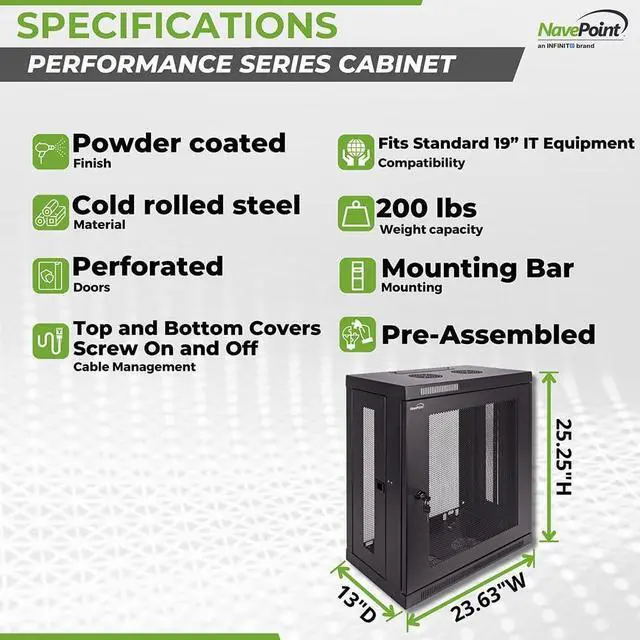 falseSAFETY & COMPLIANCE - All NavePoint products are built to industry standards. false- DURABLE - Crafted from cold-rolled steel with a protective black powder coating, the 12U NavePoint Performance Series network cabinet provides sturdy, reliable housing for network and server equipment. Capable of supporting up to 200 lbs, it's an ideal, durable solution for installers working on long-term projects.