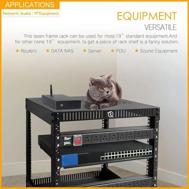 - STURDY TOP& BOTTOM PLATES: Half cabinet half rack designing. 6U 4 post open frame rack with reinforced top & bottom vented plates, a good balance between air ventilation and firm structure, is convenient to put your laptop, laser projector, game console, CD player, or even a beautiful plant on the rack. This open frame 6u rack supports maximum 500 lbs. 220 kgof rack mounting equipment with leveling feet, and 400 lbs. (180 kg) equipment with casters