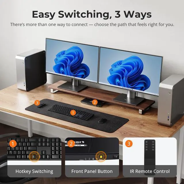 Emulators: With EDID emulators in each input port, your computers always receive the correct display informationensuring maximum compatibility and preventing issues like flickering, resolution mismatch, or no signafalseEasy Switching OptionsHDMI 2 monitor KVM lets you switch between sources via HotkeysFront panel buttonIR Remote (AAA batteries not included) no more swapping HDMI cables. Simplify your desktop setup across PCs, laptops, consoles, and streaming devicesfalse- 2 (HDMI+HDMI+USB-B) Inputs & 2 HDMI OutputsSeamlessly access 2 desktops or laptops using 2 monitors and one set of keyboard and mouse. Easily set up dual-monitor display per system, or split display across both systems (one on each monitor), while toggling your keyboard and mouse control. Need to monitor system A while working on system B? Just press Scroll Scroll 3, then double-tap Right Alt done!