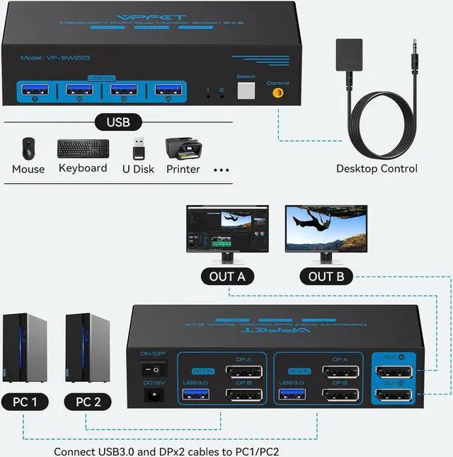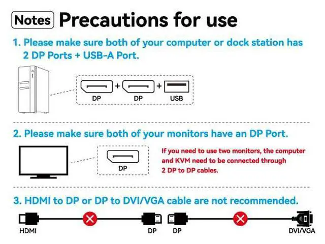Workmanship: This KVM Switch is sturdy, quiet, compact, drop-proof, heat dissipation, has a metal casing, well-made, and the DC12V/1A power supply provides sufficient energy for the switch to work more stably. And it can be compatible with many operating systems, such as Windows 7/10/8/ 8.1 /7/Vista/XP, Linux and Chrome OSfalse- Displayport Dual Monitor KVM Switch: The DP KVM switch allows two computers or laptops to share two monitors and four USB devices, which can effortlessly handle multiple monitors, whether you are working in a home office or a professional environment, this KVM switch provides seamless switching and increased productivity.
