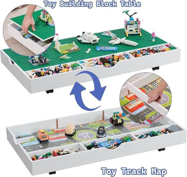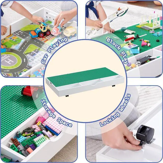 It is clear and concise and will help you to complete the assembly task quickly. false- Versatile 2-in-1 DesignGABHX The construction play table offers 2 different entertainment with its built in plate, featuring block board and city road map. The top with the brick base, compatible with Lego, allows kids to play construction game. Take it off, and switch to playing with cars and trains at the bottom of the table.