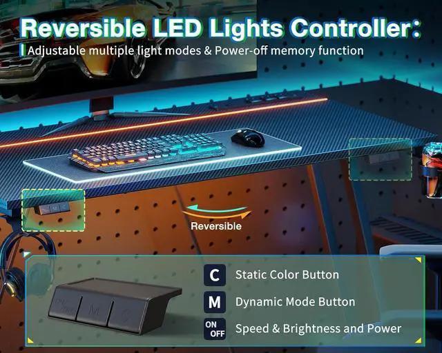Built-in LED Lights: This small gaming desk is equipped with customizable built-in LED light strips. With its easy-to-use remote control, 10 colors, and 20 modes, choose from 10 vibrant colors and 20 dynamic mode to create an immersive gaming atmosphere that enhances your experience.