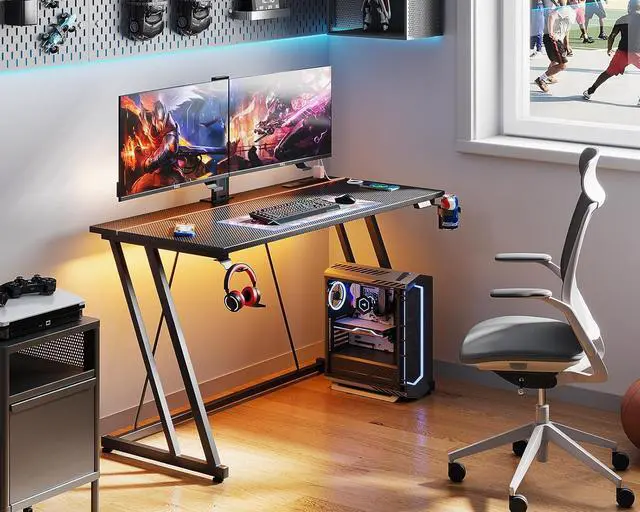 47 Inch Gaming Desk with LED Lights & Power Outlet, Computer Desk for Small Space, Gaming Table with Carbon Fiber Texture, Kids Desk Gift for Boys Men, Black