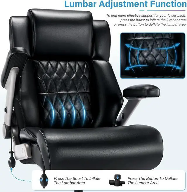 - Inflatable Lumbar Support Prevents Back Pain our executive office chair boasts an inflatable lumbar support feature that allows you to customize your back support depending on your needs. All you have to do is use the airbag to inflate and adjust the lumbar area to your preferences for optimum comfort during the day. You can also change the seat's height to find the best position and complete your working and studying tasks with maximum convenience
