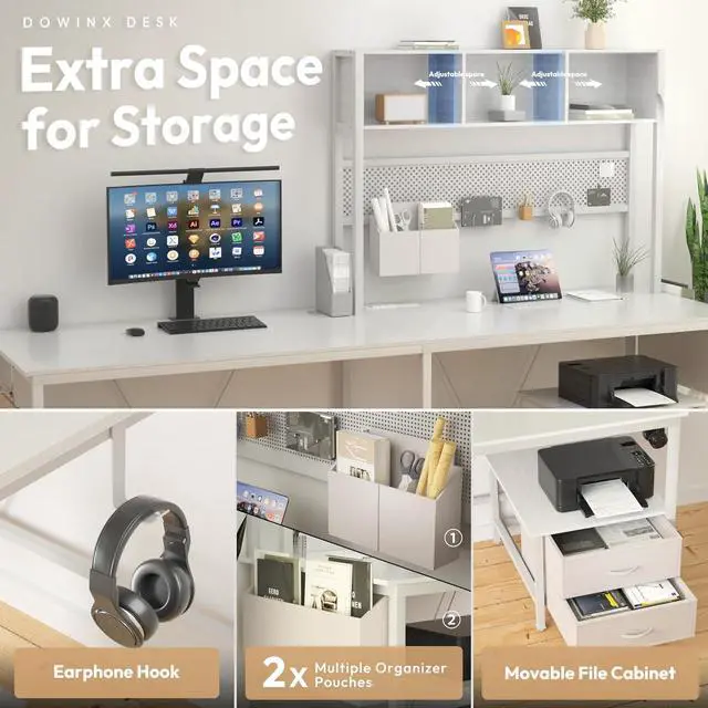 - Create the Ideal Workspace: The L-shaped desk comes with top hutch, pegboard with 5 hooks, removable drawer, headphone hook, 2 storage bags, power outlets, LED lights, cable management holes, and an extra-long desk that can accommodate up to 4 monitors. Support your ideal office space or gaming space