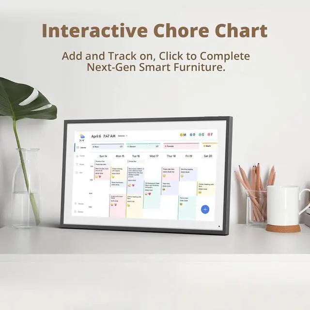 - Interactive Chores Chart & Dinner Planner: Our digital calendar keeps housework organized and motivates family members, especially children, to develop healthy habits with an interactive chore chart. Display your family dinner plans to keep everyone informed and eliminate the daily "What's for dinner? " question.