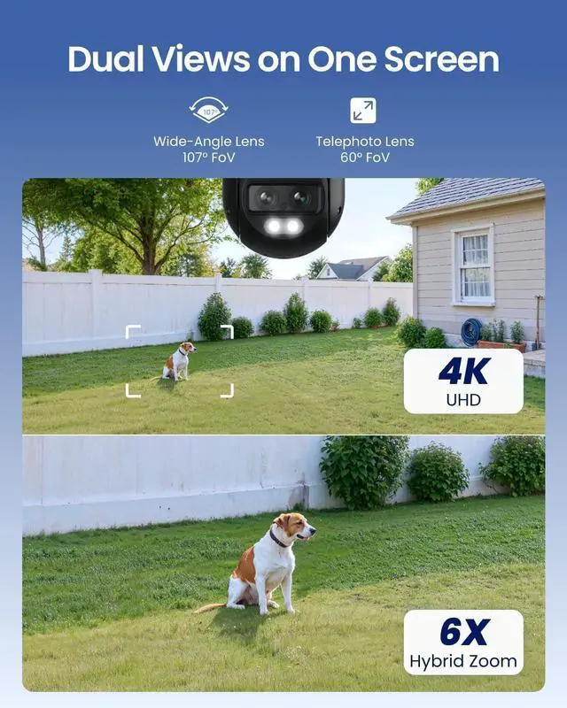 ZOOM: The dual telephoto lens and 360° wide-angle PT lens enable auto tracking and 6X hybrid zoom to closely follow and focus on the target. You can have an ultra-wide overview and a clear close-up look at the same time in one screen.