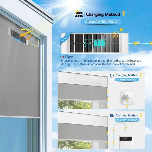 - TipsElectric shades can be charged not only through the complimentary solar panel, but also through Type-C and power banks. Please keep the solar panel plugged in and securely inserted, as this will prolong the lifespan of the blinds. The shade is set up already and it will automatically stop at the top and bottom 72", if your window height is less than 72", Please set your limit of bottom according to the manual.