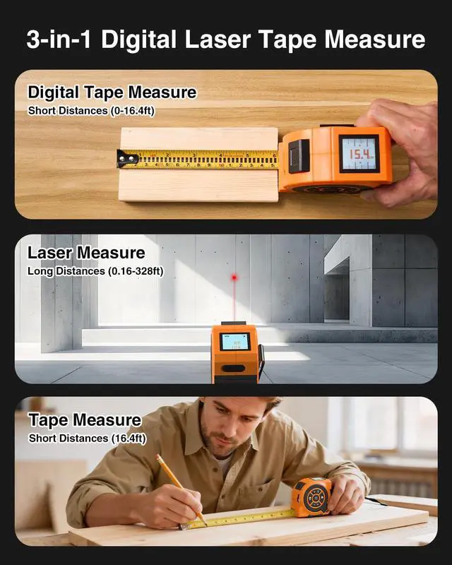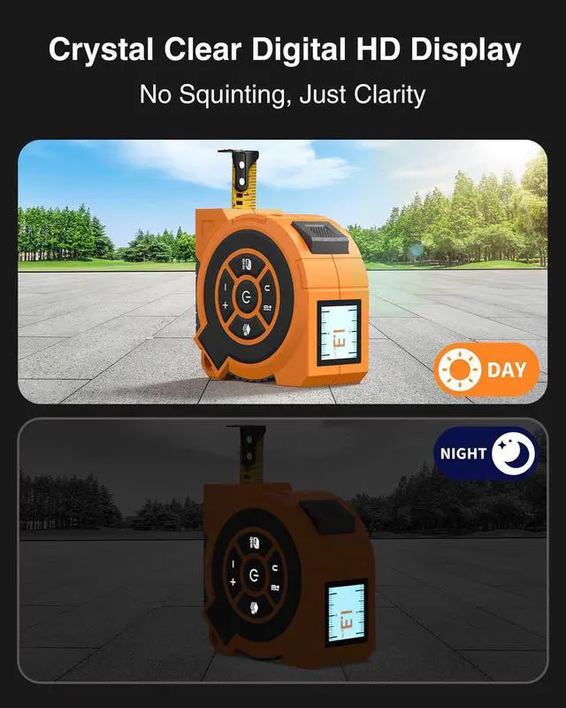 HD TFT Color Screen for Clear Readings: The laser measure tajpe features a 1.44 -inch TFT color display with 128x128 resolution, presenting tape and laser measurements clearly and simultaneously, making them easy to readeven under bright sunlight. High brightness ensures visibility in any lighting condition. Ideal for professionals and DIY enthusiasts across industries such as interior design, electrical work, carpentry, and real estate, who need fast and reliable digital readouts.
