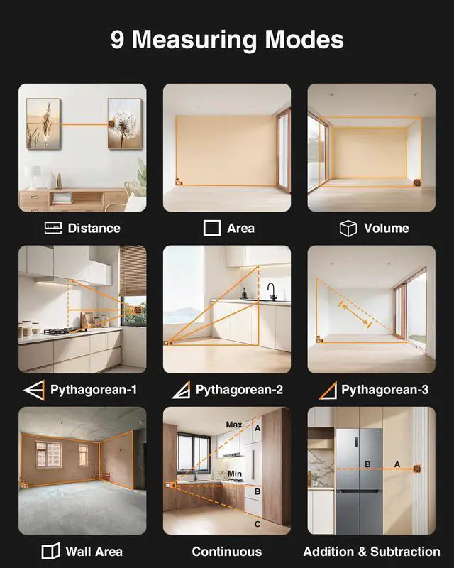 Complex Environments: Quickly andd accurately measure any space with this digital tape measure, supporting 4 units (ft, in, m, ft/in), 6 modes (Distance, Continuous, Area, Volume, Pythagorean TWo Points, Pythagorean Three Points), and 2 reference points (front, rear). Effortlessly handle different structures, angles, and spaces - perfect for compliex construction sites and interior design projects.